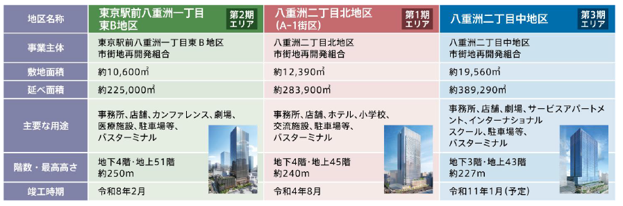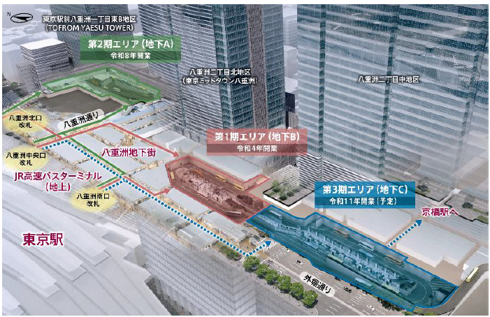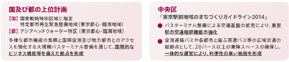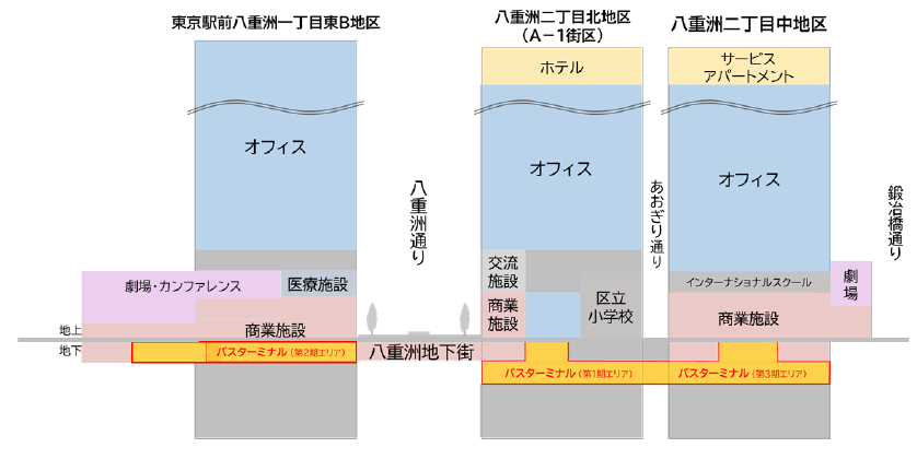本バスターミナルは、3地区の市街地再開発事業にまたがり、各地区の地下に段階的に整備を進めているもので、東京駅前における広域的な交通結節機能の強化を目的としています。(※1)
