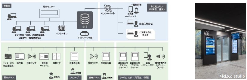 「スマートターミナルシステム(STS)」は、案内表示、構内放送、ダイヤ情報などをクラウド上で連携させ、管制室から一元管理することで、サービスの質を保ちながらも省人化と業務効率化を実現できるシステムです。本システムは、第1期エリア(地下B)開業時に京王電鉄バスと株式会社Will Smartが共同開発・導入しました。統一した運営システムを用い、複数エリアにまたがる本バスターミナルの運営をサポートします。