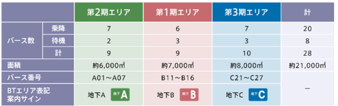 現在整備中の第3期エリア(地下C)の竣工後、第1期エリア(地下B)(令和4年(2022年)9月開業済)と接続し、全体開業は令和11年(2029年)を予定しています。全体開業時には国内最大級(乗降用20バース、約21,000㎡)の高速バスターミナルとなります。