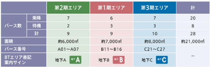 第2期エリア(地下A)はJR東京駅(八重洲北口および八重洲中央口)から八重洲地下街を経由し、地下レベルで直接アクセス可能な位置にあり、乗降用7バース(待機用2バース)を備えています。第1期エリア(地下B)(※2)と合わせると、乗降用バースは合計で13バースとなり、首都圏と全国各地(東北、北陸、甲信越、東海、関西、四国、九州)を結ぶ交通結節点としての機能が一層強化されます。