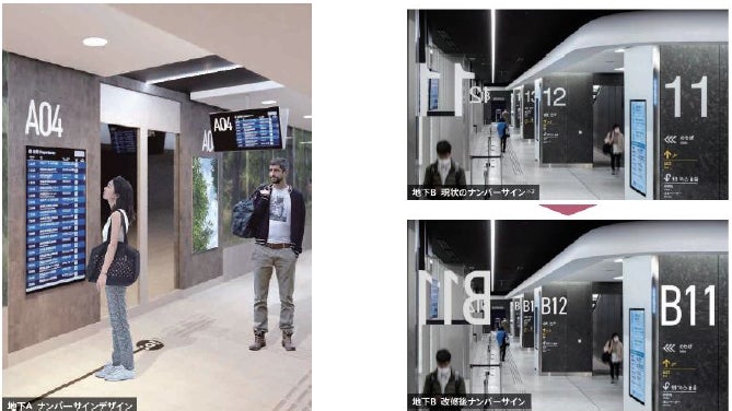第2期エリア(地下A)の開業にあわせて各エリアのナンバーサイン(バース番号)を「エリア表記(A~C)+番線」に統一し、計画中の第3期エリア(地下C)を含む3エリア全体で整合のとれた誘導サインとしました。