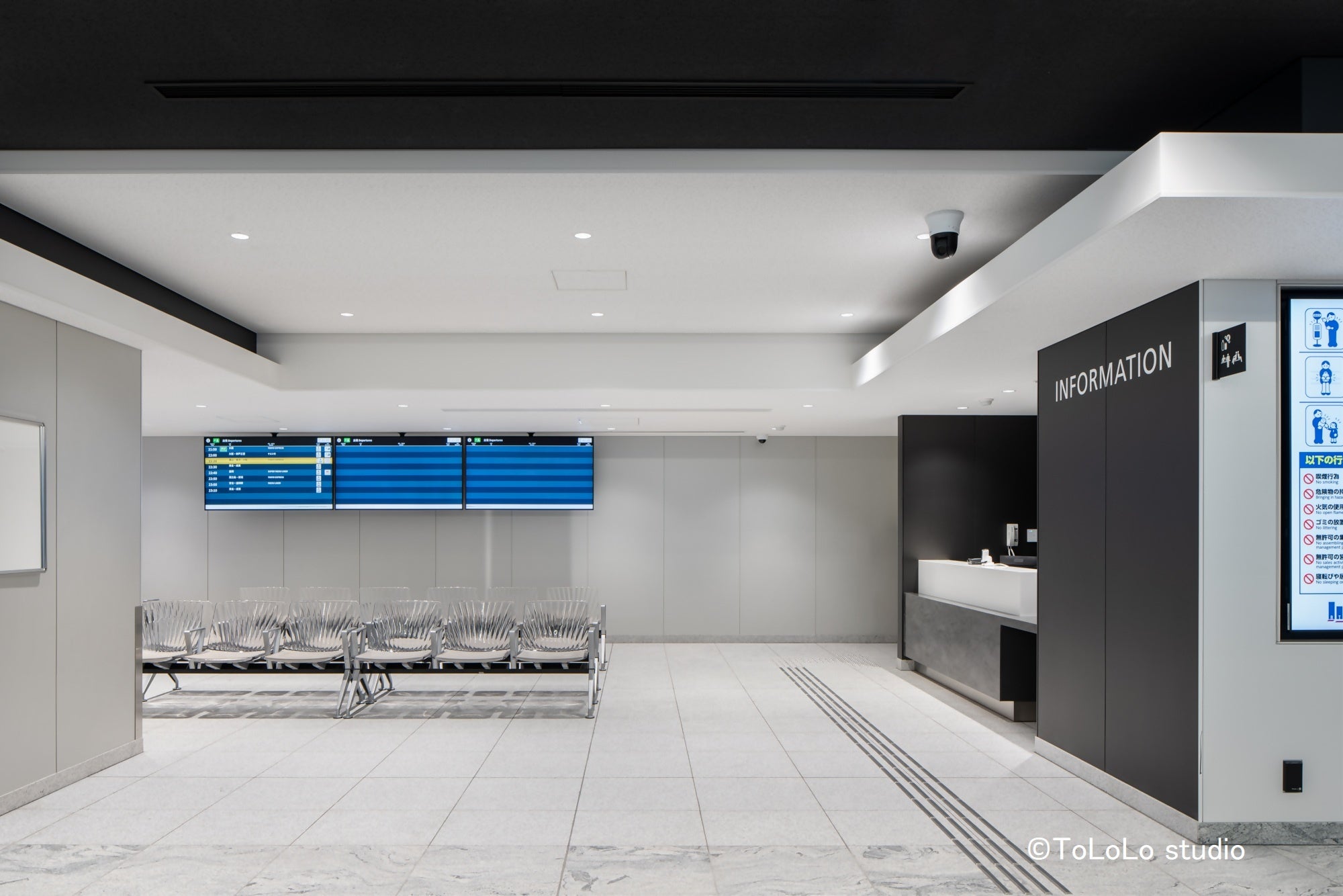 通路と待合スペースにおいて、床や天井の色調・高さに変化をもたせ、移動空間と滞留空間を視覚的に区分し、混雑緩和を図ります。また、快適にお待ちいただけるよう、100席を超える座席を設置しています。