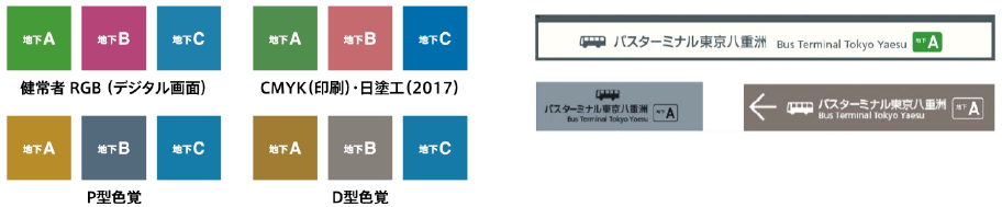 案内サインの配色は色覚バリアフリーに配慮した色設計を採用し、幅広いお客様にとって視認性の高い情報を提供します。