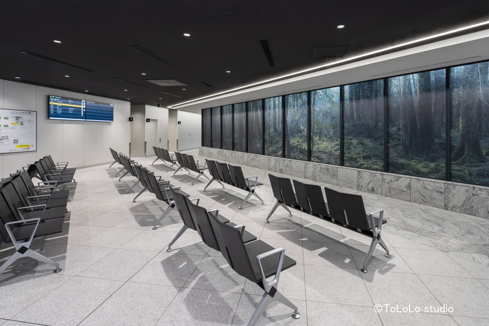 バスターミナルを一周する旅客エリアと車路を隔てるサッシのガラス面には、写真家が撮り下ろした日本の四季折々の自然風景写真をダイナミックに配置しました。訪れるお客様が、新緑や紅葉の木々の中に立っているような没入感を体感できる、新しい空間を実現しています。