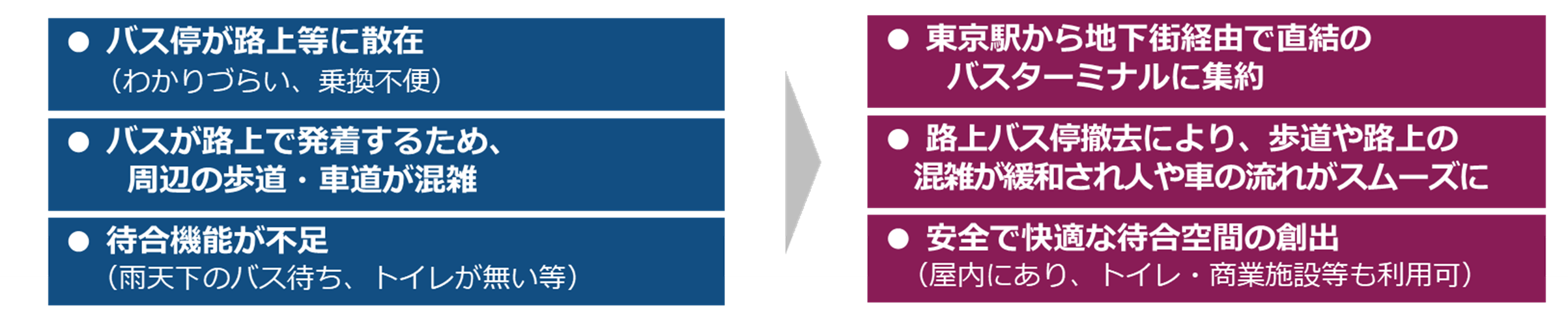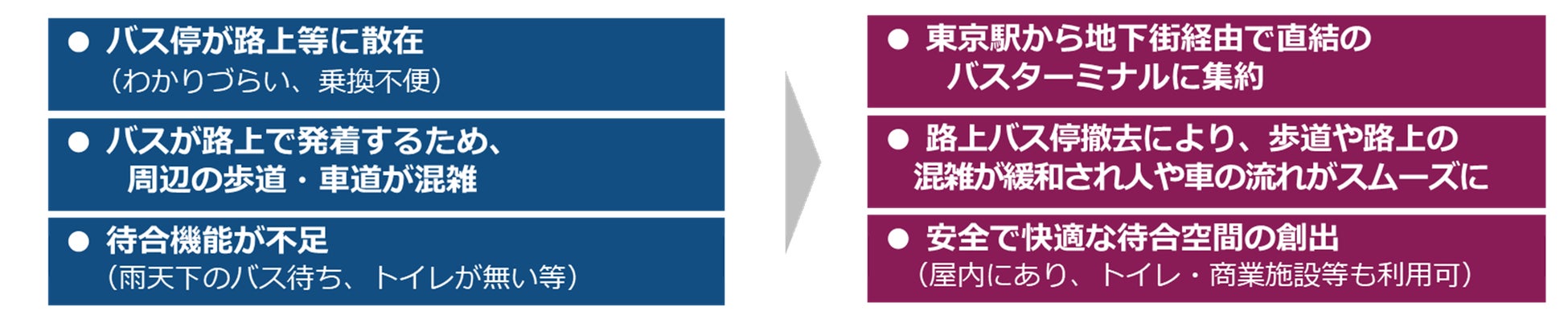 国際都市東京の玄関口である東京駅周辺(八重洲側)では、各方面に向かう高速乗合バス、空港連絡バス等の発着する停留所が駅前交通広場内では充足できず、周辺の道路上に散在していました。鉄道等との乗換えが不便であることや、道路上での乗降により円滑な車両交通及び歩行者通行が妨げられている等の課題がありました。
