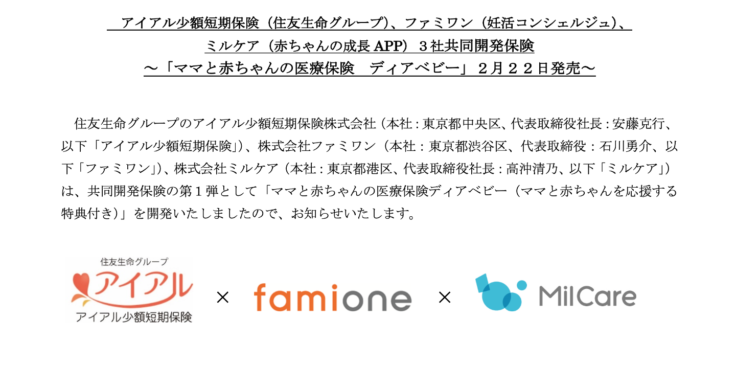 アイアル少額短期保険(住友生命グループ)、ファミワン(妊活コンシェルジュ)、ミルケア(赤ちゃんの成長APP)3社共同開発保険~「ママと赤ちゃんの医療保険 ディアベビー」2月22日発売~
