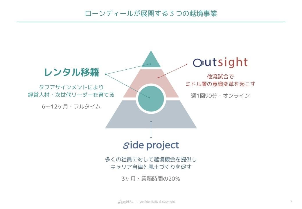ローンディールは2015年に事業を開始し、大企業人材を一定期間スタートアップに送るレンタル移籍を提供してきました。最近では目的や期間の異なる新たな越境プログラムをスタートをしており、2021年からはミドルマネジメント向けの他流試合となる「outsight」、2023年からは業務時間の20%・3ヶ月の間でスタートアップに参画する「side project」を開始しました。