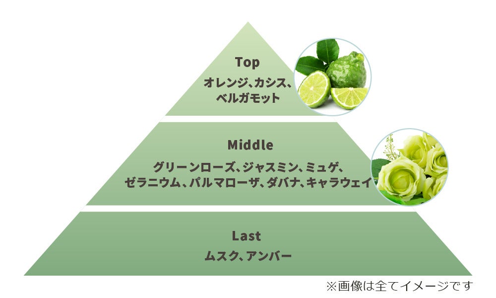 MIDDLE:グリーンローズ、ジャスミン、ミュゲ、ゼラニウム、パルマローザ、ダバナ、キャラウェイ