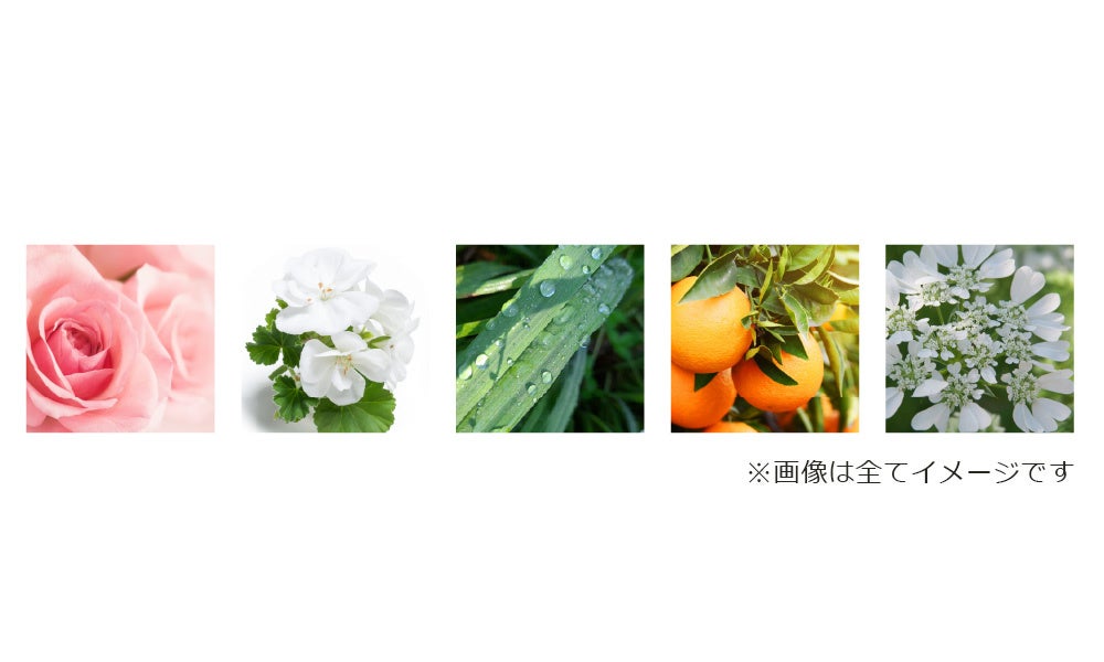 香料に「ローズオイル、ゼラニウムオイル、パルマローザオイル、オレンジオイル、キャラウェイオイル」をブレンドし、天然精油ならではの奥行きと深みを演出しています。