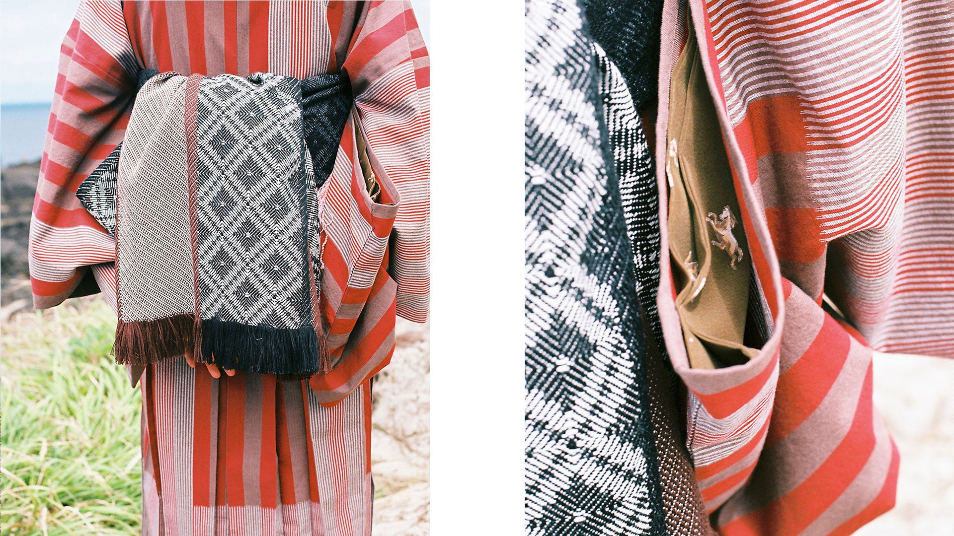 中でも、KIMONO by NADESHIKOで欠かせない存在である久留米絣のきものは綿糸がほとんどですが、実はいろいろな糸を織り込んでくれるワクワクの詰まったさんちです。今回は秋冬を代表するウール糸を新たに織り込むチャレンジをしました。ウールが合わさることでふわふわと毛羽が立って、季節感のある優しい風合いに仕上がりました。大胆な縦横の縞模様は着姿になるとインパクトがありながら、絣ならではの優しい雰囲気とのバランスが魅力です。
