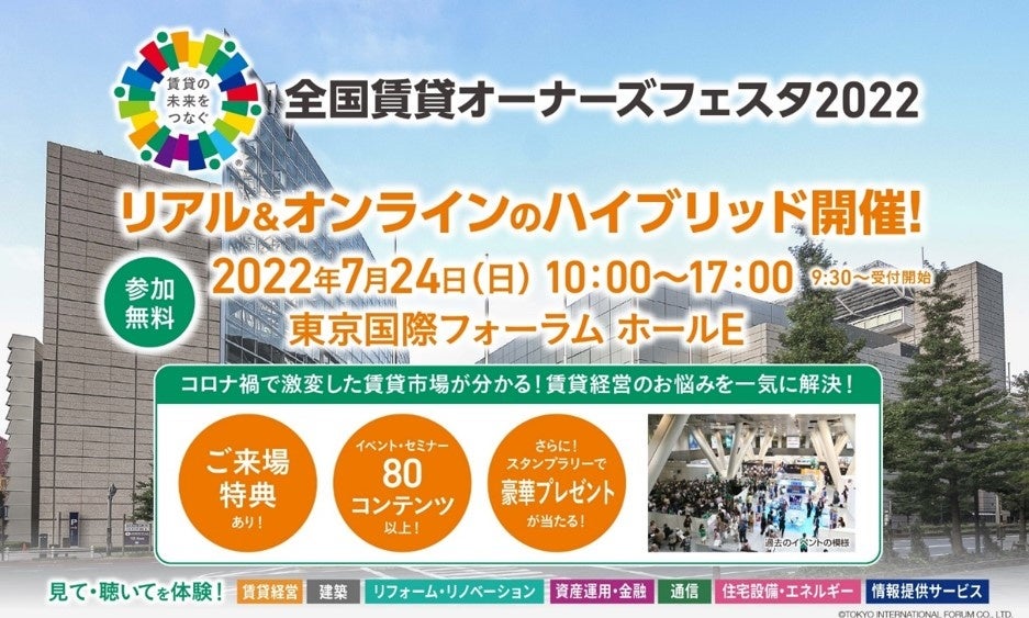 株式会社エイブル(本社:東京都港区、以下エイブル)は、賃貸オーナー様や不動産投資家などを対象とした「全国賃貸オーナーズフェスタ2022」を、2022年7月23日(土)・24日(日)の2日間、有観客とオンライン配信のハイブリッド形式にて開催することが決定いたしました。24日(日)は、東京国際フォーラムに会場を設け、感染予防対策を徹底したうえで有観客でのセミナーを実施いたします。23日(土)・24日(日)に行われるオンライン配信では、複数のチャンネルにて配信を予定しており、ご自宅でもお気軽にお楽しみいただけるオンラインコンテンツとなっております。