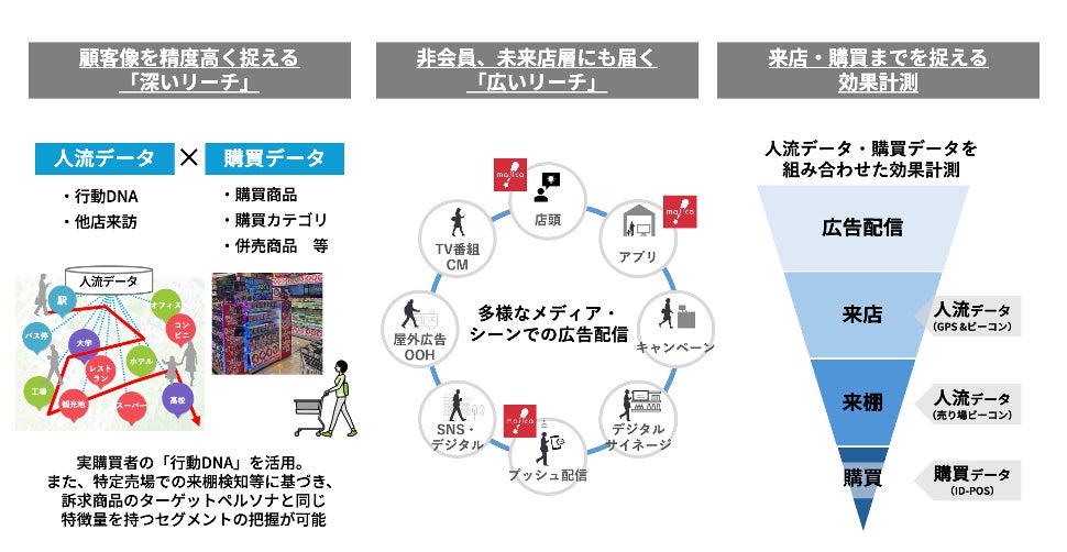 国内約1,400万の「majicaアプリ」ユーザーだけでなく、unerryの「Beacon Bank」が連携する国内1.5億IDのユーザーへの店舗周辺でのアプリプッシュ、デジタル広告、コネクテッドテレビ、OOHなど多様なメディアでの幅広い配信が可能