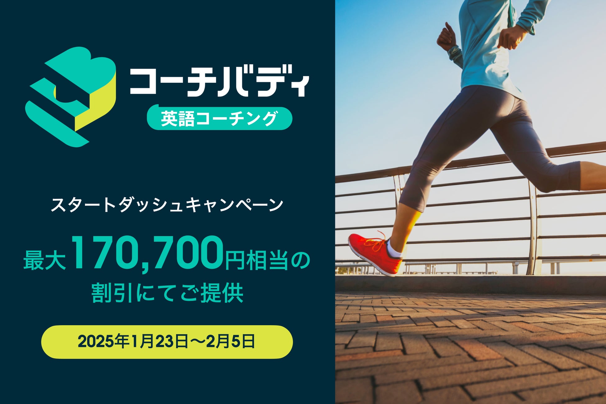 株式会社スピークバディ(本社:東京都中央区、代表取締役社長:立石剛史、以下「当社」)は、当社が提供するスピーキング特化型オンライン英語コーチングサービス「コーチバディ」において、この度「英会話スタートダッシュキャンペーン」を実施いたします。本キャンペーンでは提供中のすべてのコースが対象となりコースにより60,700円から最大170,700円相当の割引となります。