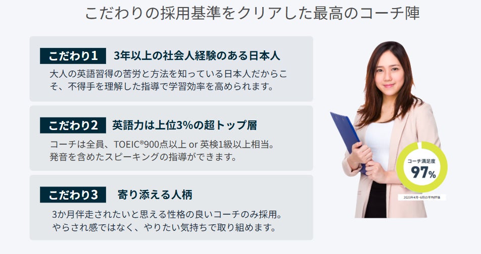 業界最高水準の日本人コーチによる「寄り添い型」コーチングで、緊急度の高い英語ニーズに対応する