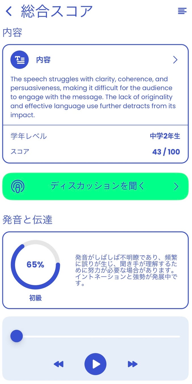 最新AI技術を使い、音声でも結果を分析してフィードバックを行います。ポッドキャスト方式で、AI講師のBenとJaneが登場し、意見交換しながらスピーチの弱かった部分を評価します。音声によるフィードバックで、リスニング力のアップにもつながります。