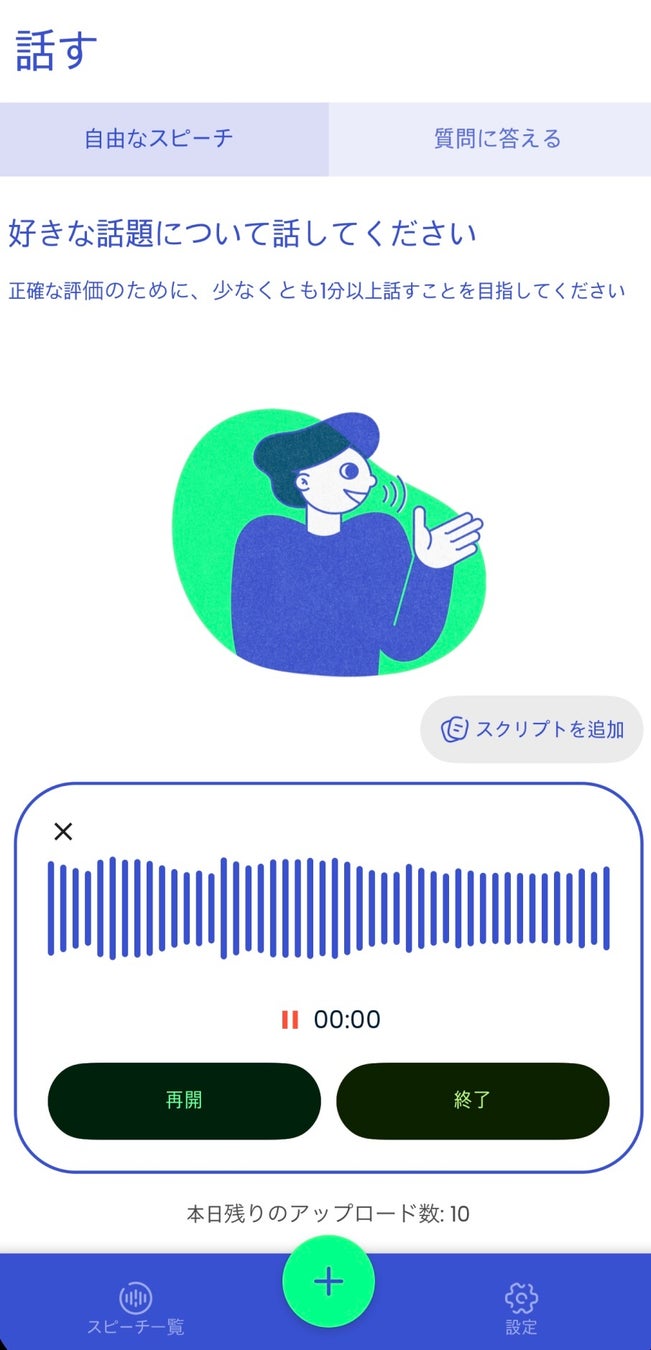 スクリプト欄に、スピーキングの文章を事前に入力することができます。スクリプト機能を利用することで、AIがより正確にフィードバックできるようになります。アプリに予め用意してあるスクリプト原稿を使って、スピーキング練習をすることも可能です。