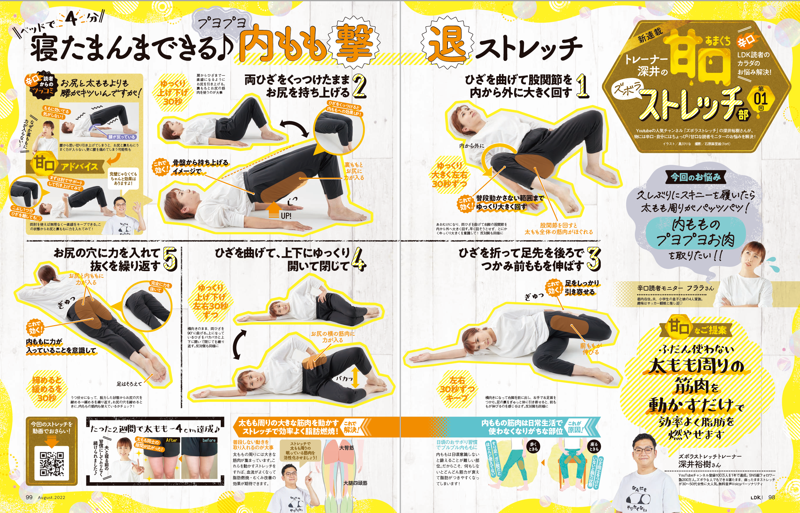 YouTube人気チャンネル「ズボラストレッチ」で話題の深井裕樹さんが、読者モニターさんのカラダのお悩みを解決する新コーナーがスタートしました。誌面掲載のQRコードから、詳しいストレッチ法を動画でもチェックできます!