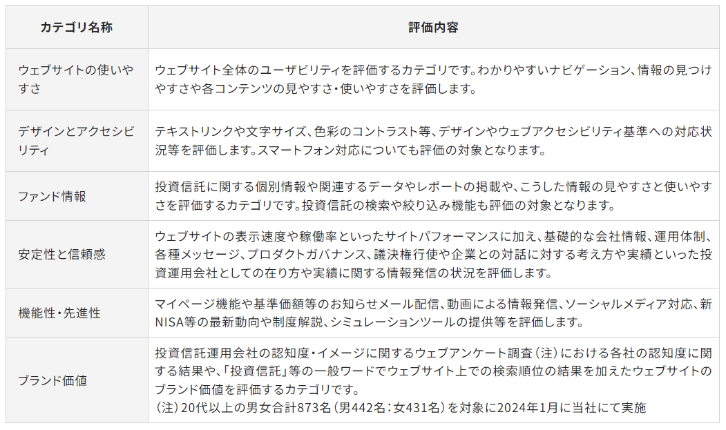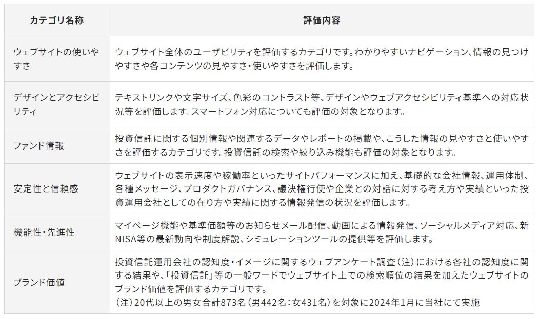 さらに、本ランキングに先行して、当社では投信運用会社の認知度・イメージに関して20代以上の男女合計873名(男442名:女431名)を対象にウェブアンケート調査を実施しました。この調査結果における各社の認知度や、「投資信託」等の一般的なワードで検索した場合の各社のウェブサイト上での検索順位についても、企業とそのウェブサイトが有するブランド価値として、本ランキングの調査結果に評価項目として組み込まれています。
