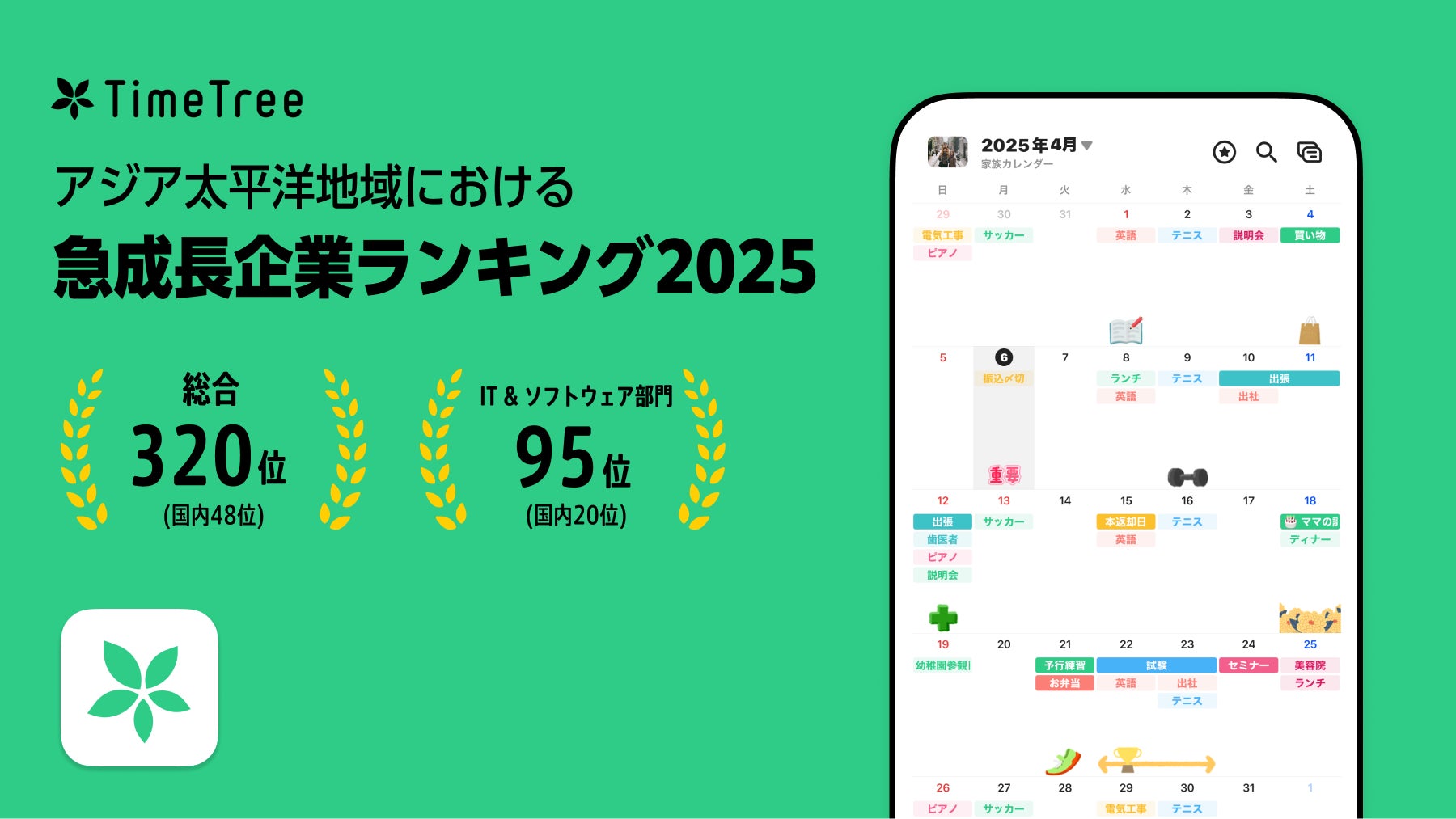 世界中の人々の時間を豊かにする株式会社TimeTree(本社:東京都新宿区、代表取締役社長:深川 泰斗、以下TimeTree)は、英・Financial Times社と独・Statista社が共同で実施した、アジア太平洋地域における急成長企業ランキングの上位500社を選出する「FT ranking: High-Growth Companies Asia-Pacific 2025(アジア太平洋地域における急成長企業ランキング2025)」において、総合ランキングで320位(国内 48位)、IT&ソフトウェア部門で95位(国内 20位)に選出されました。
