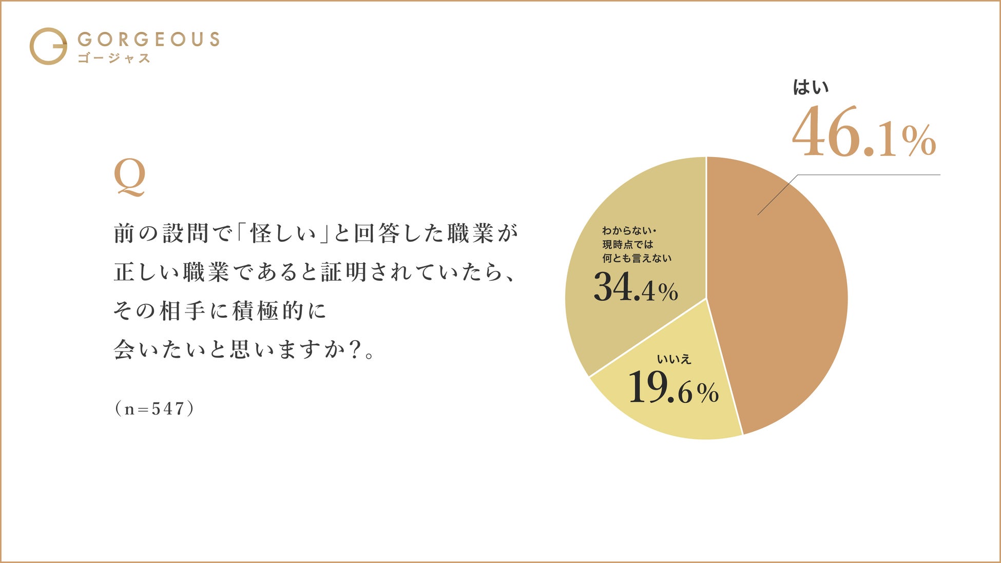 怪しいと思う職業について、相手の職業が証明されていれば、積極的に相手に会いたいと思う人は46.1%。