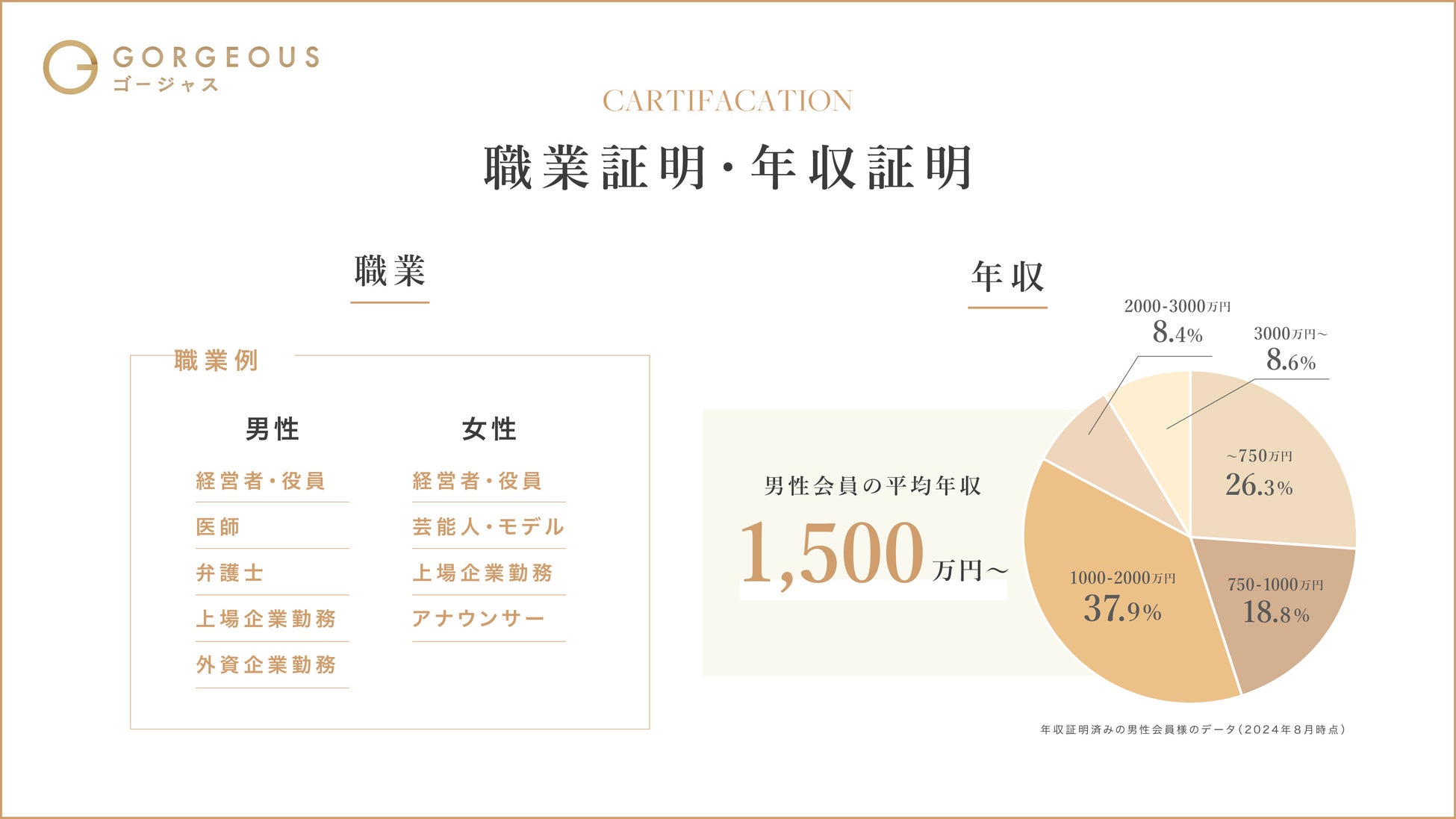 ゴージャスでは、「経営者・役員」、「医師」、「芸能人・モデル」、「弁護士」など多様な職種において職業証明をされている方がいます。また、年収証明済みの会員の平均年収は1,500万円以上となっています。