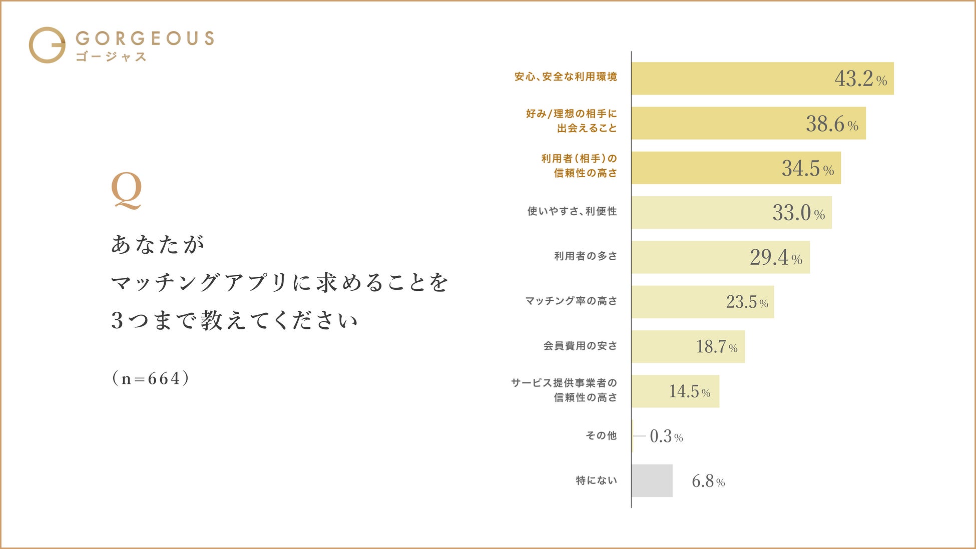 ◼️マッチングアプリに最も求めることは、「安心、安全な利用環境」(43.2%)次いで「好み/理想の相手に出会えること」(38.6%)、「利用者(相手)の信頼性の高さ」(34.5%)