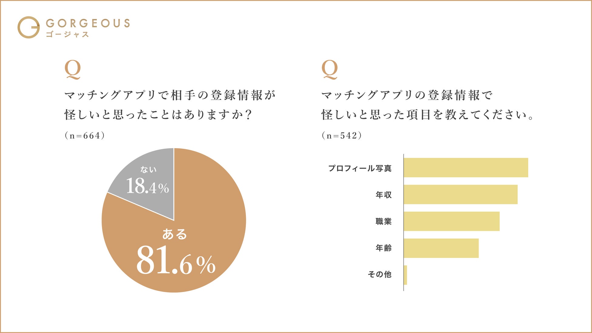 真剣な出会いを目的とした利用が多い一方で、マッチングアプリ利用経験者の80%以上が、「相手の登録情報が怪しいと思ったことがある」と回答。怪しいと思った項目の上位は「プロフィール写真」(63.7%)、「年収」(58.3%)、「職業」(49.1%)。