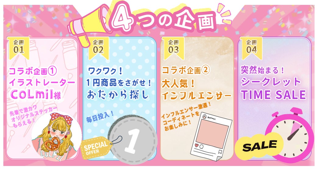 本イベントは、お得なショッピングの機会にとどまらず、1円の商品が隠されたサプライズ企画や、インフルエンサー・イラストレーターとのコラボなど、多彩なキャンペーンが魅力です。