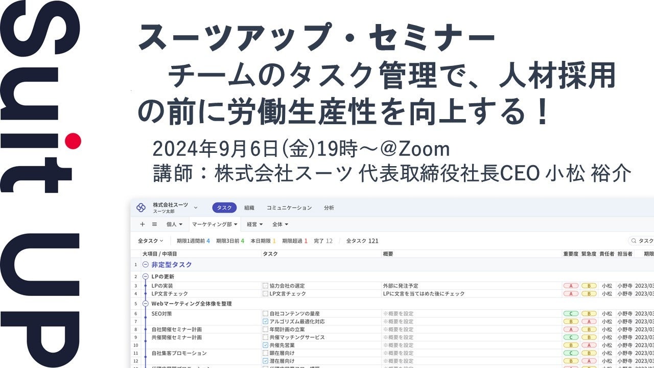 株式会社スーツ(所在地:東京都千代田区、代表取締役社長CEO:小松 裕介)は、2024年9月6日(金)19時から、当社代表の小松が講師を務めるスーツアップ・セミナー「チームのタスク管理で、人材採用の前に労働生産性を向上する!」を無料開催します。