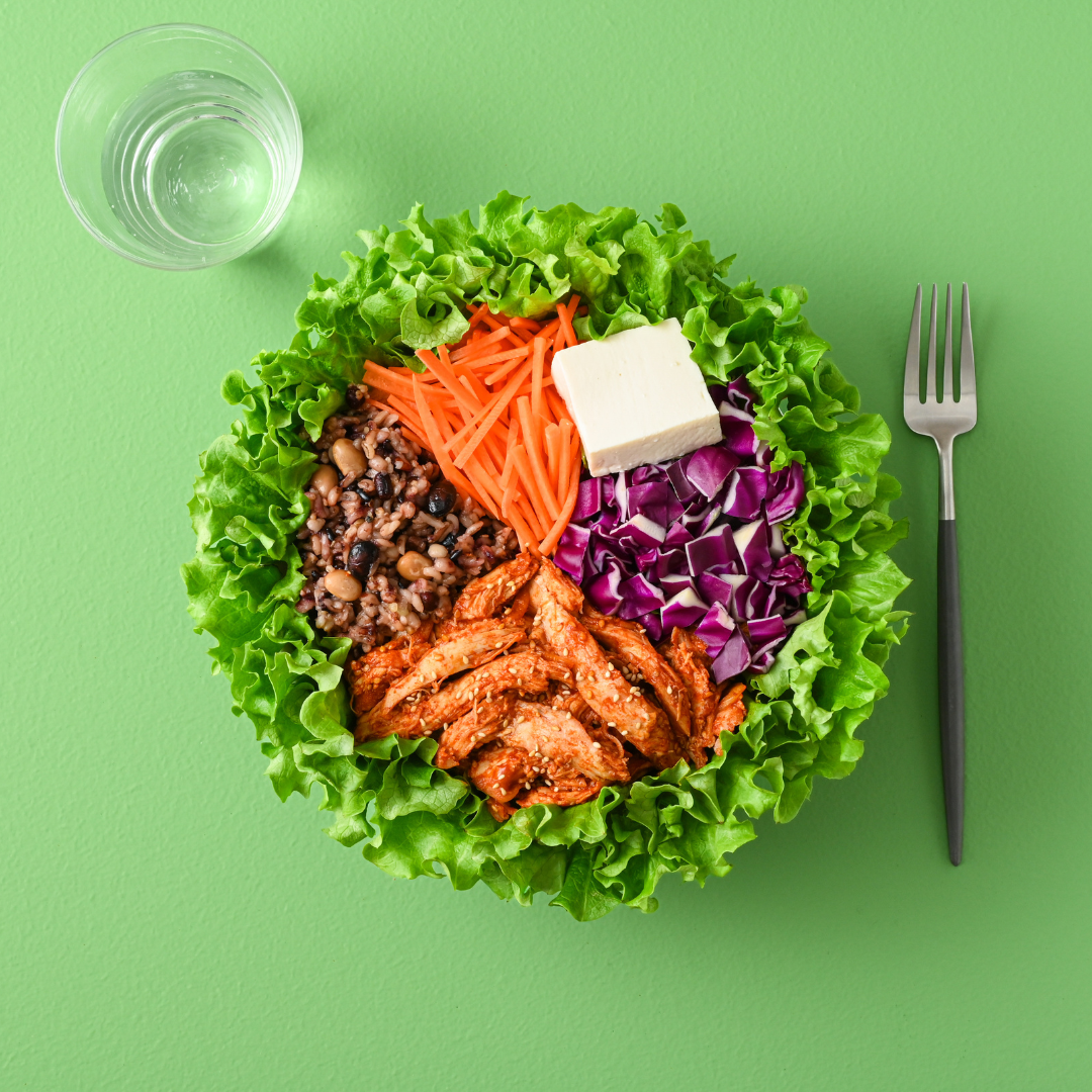 ヤンニョムチキンと十五穀米の韓国風サラダ