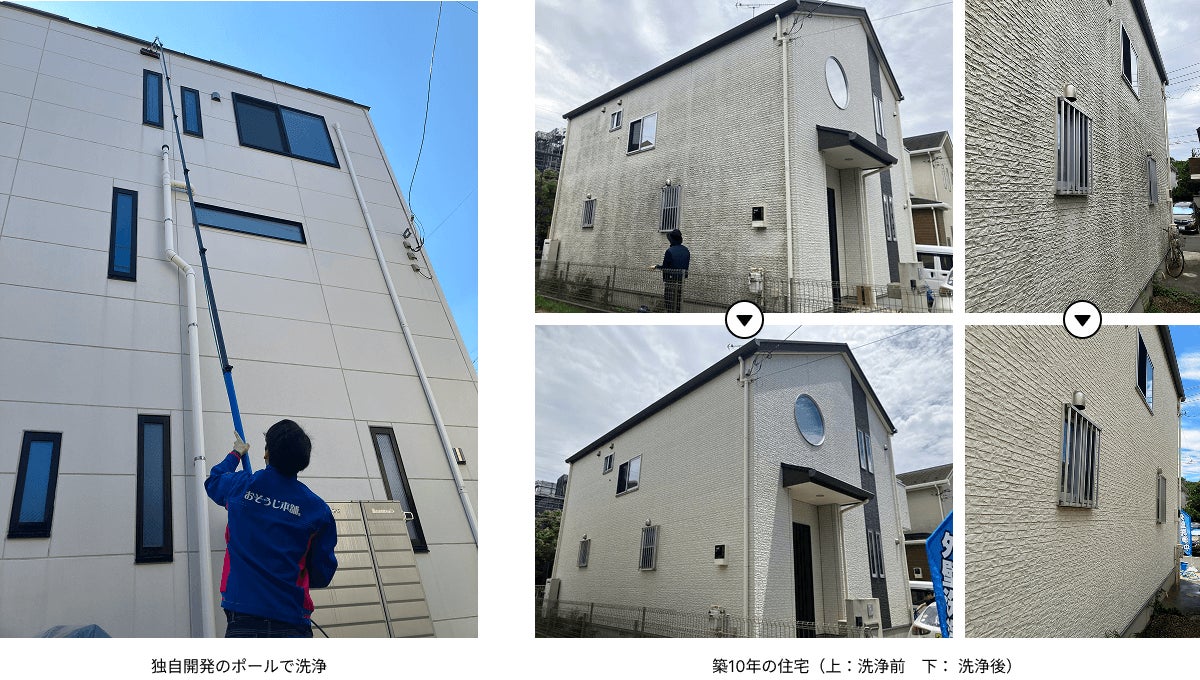 当サービスは、外壁塗装のように足場を組まず、人の手で外壁を洗浄することが大きな特徴です。ハウスクリーニングで長年培ってきたノウハウを最大限に活用し、高品質の洗浄システムを構築しました。