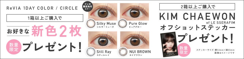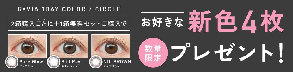 ReVIA 1day「2箱購入+1箱無料セット」1セットご購入ごとに、お好きな新色(1枚入り)×4枚をプレゼントいたします。