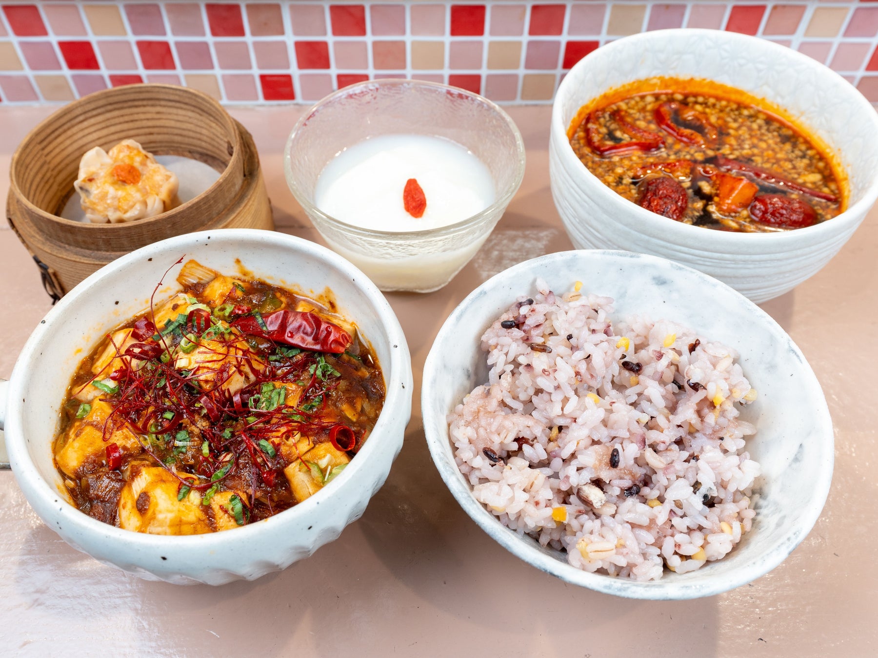 16種類以上の薬膳素材を使用し、上質な鶏ガラスープをベースに4時間以上蒸し上げた独自製法のスープは、薬膳が苦手な方にも食べやすくアレンジしています。お好みやその時の体調に合わせて、赤・白・黒・黄・緑の5種類のスープから選んでいただけます。付け合わせに各色の焼売も用意しました。