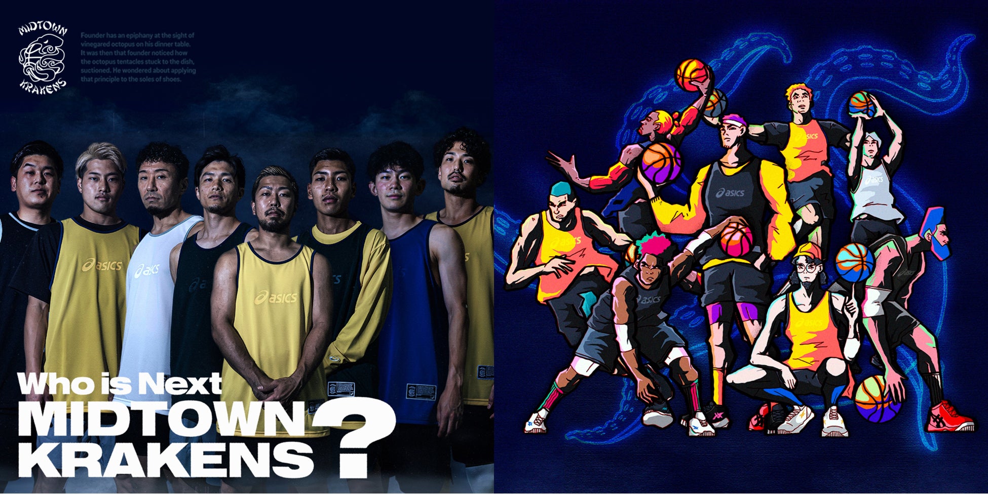 「MIDTOWN KRAKENS」は、アシックスとともにバスケットボール界に新たな風を吹かせたい、と思いを抱く架空のストリートボールチームです。アシックスと深いつながりがある蛸・クラーケンを、人を襲う怪物ではなく、大海原へ勇敢に立ち向かう進化と革命の象徴としてとらえました。