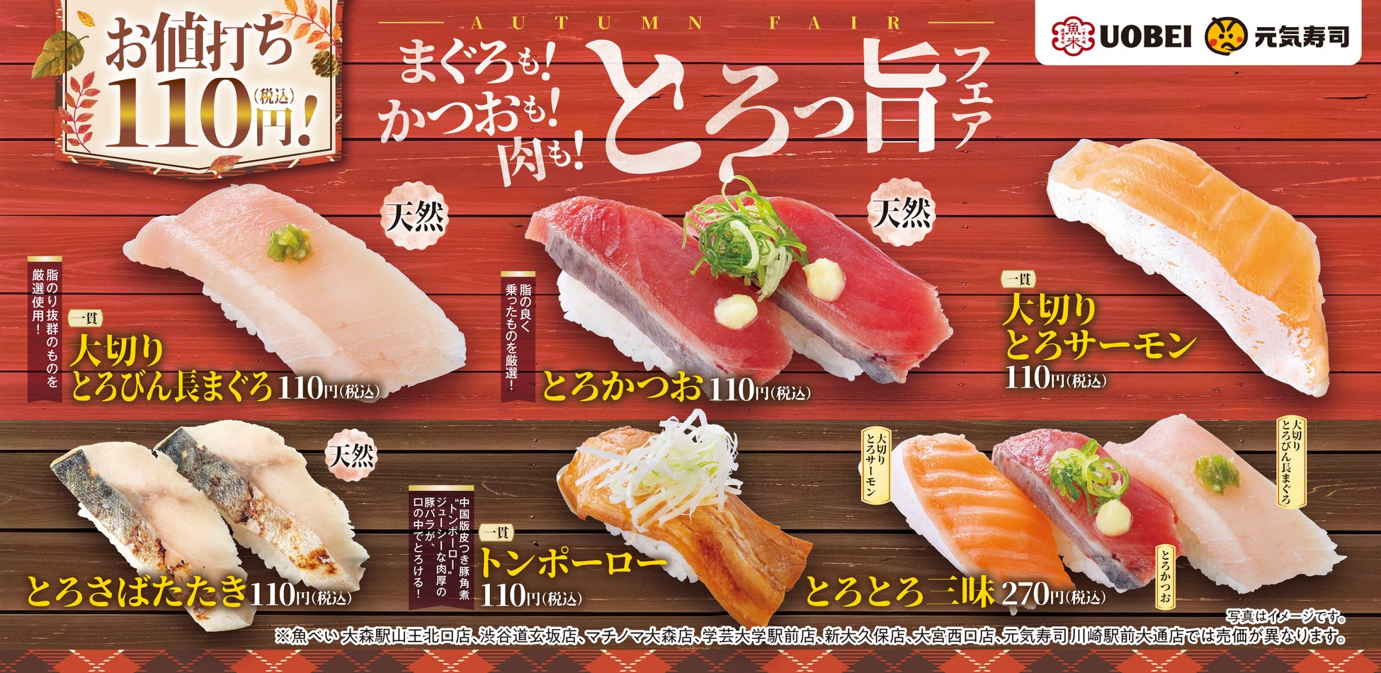 寿司レストランチェーンを展開する元気寿司株式会社(本社:栃木県宇都宮市 代表取締役会長兼社長 藤尾 益雄)は、全国の元気寿司・魚べいにて2022年10月19日(水)より期間限定で、『まぐろも!かつおも!肉も!とろっ旨フェア』を開催いたします。口の中でとろっと広がる脂の旨みをぜひこの機会にご堪能ください。