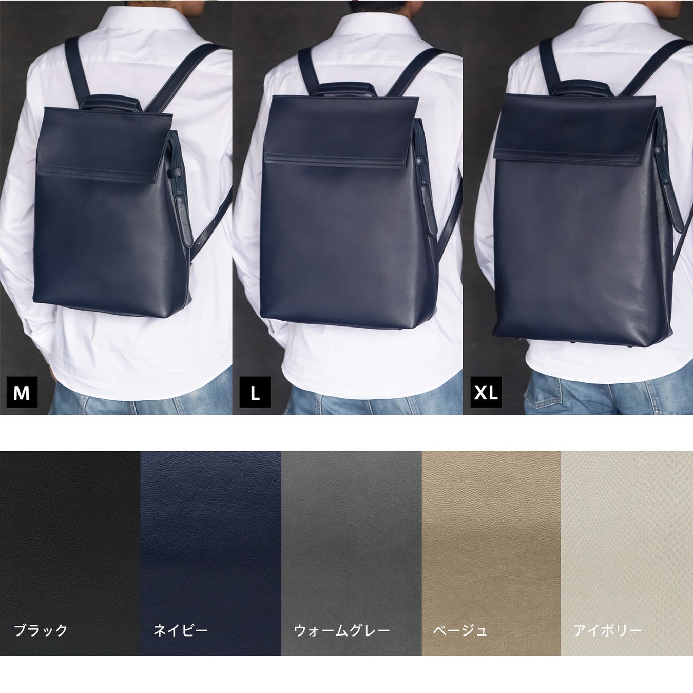 持ち物やスタイルに合わせて選べる3サイズ。M、Lのほか、Makuake限定のXLサイズもご用意しました。