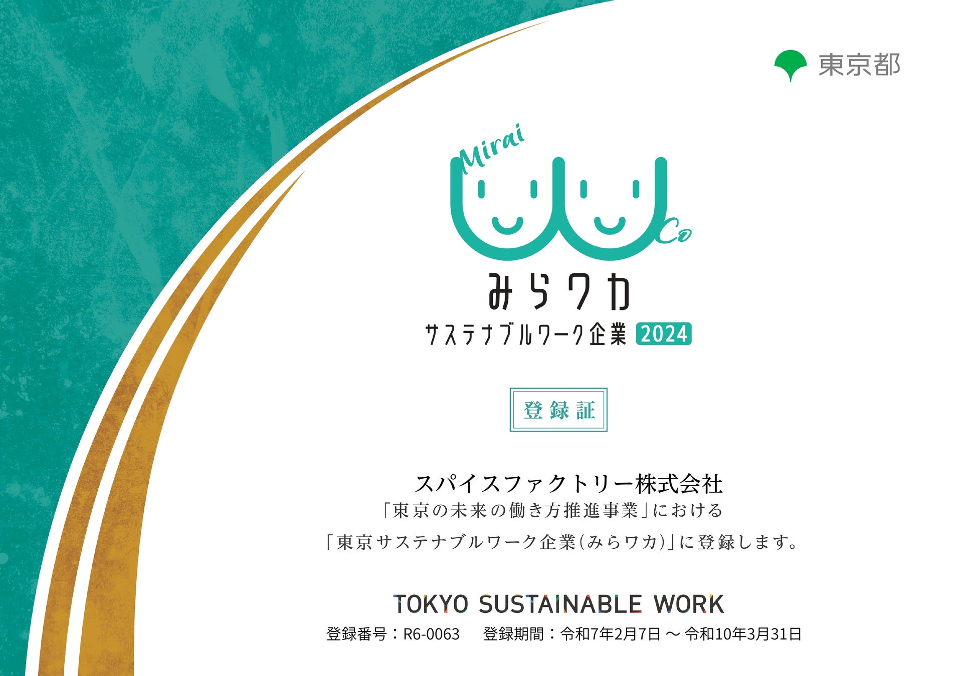 デジタル・トランスフォーメーションを⽀援するスパイスファクトリー株式会社(本社:東京都港区、代表取締役CEO:高木 広之介、以下、当社)は、「東京の未来の働き方推進事業」における「東京サステナブルワーク企業(みらワカ)」として登録されたことをお知らせいたします。