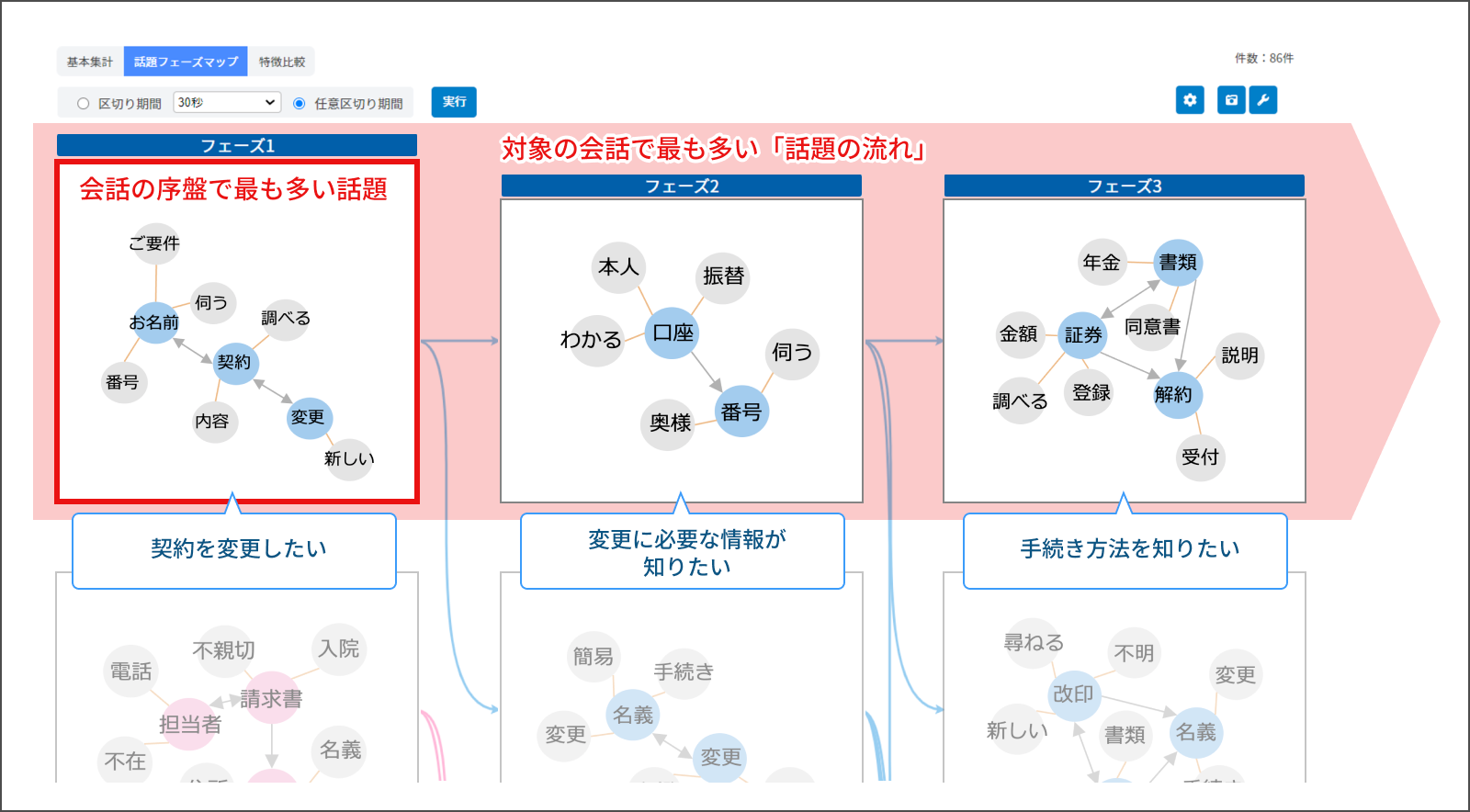 フェーズ1では、対象の会話の序盤で最も多く登場する話題を特定します。最初に最も知りたい話題がつかめることで、CSを左右する初手の対応品質向上にデータを活かせます。最上部、各フェーズのマッピングを見ることで、対象の会話から「最も多い会話の流れ」を把握できます。フェーズ1の対応に務めつつ、次に出てきやすい疑問・質問を把握しておくことで、さらなる品質強化、長引いてしまった顧客対応要因を視覚的につかみます。