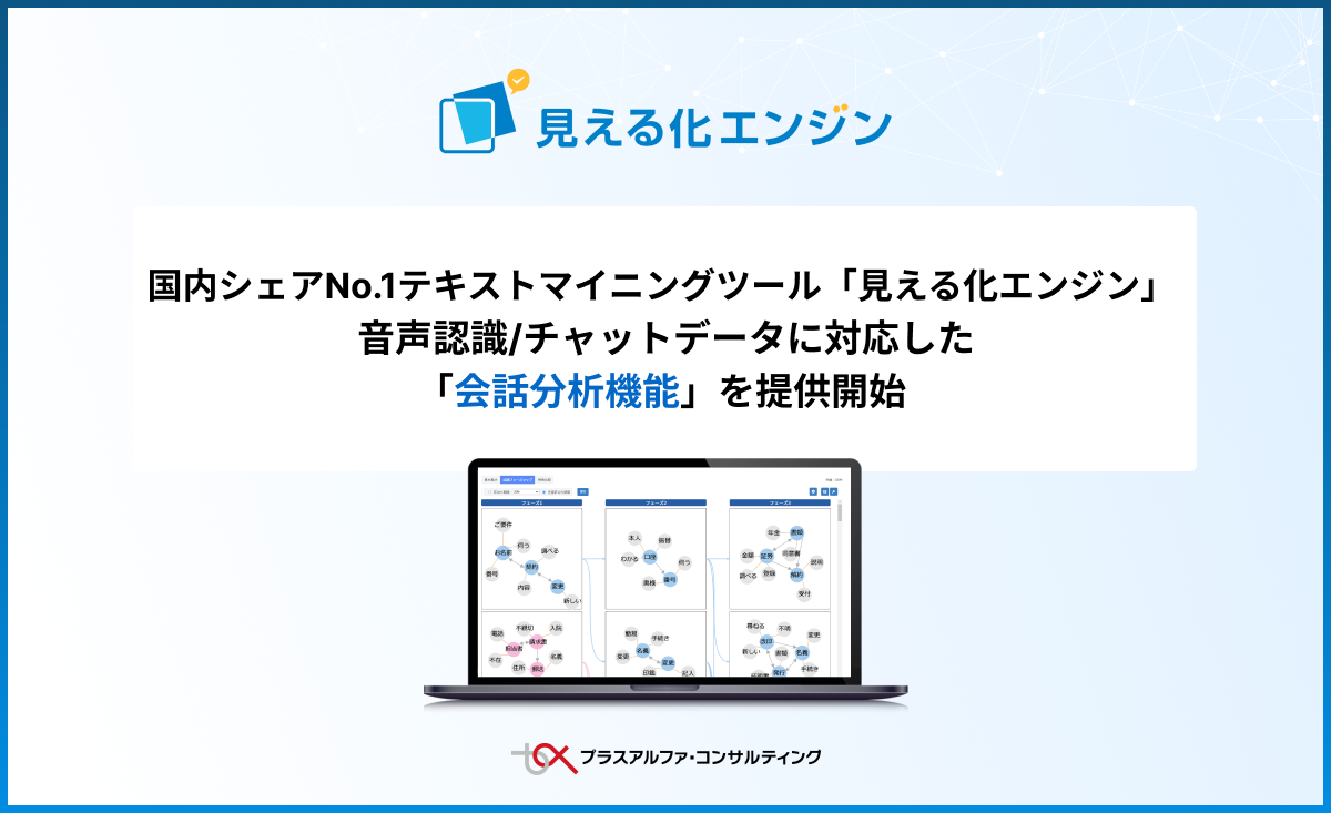 株式会社プラスアルファ・コンサルティング(本社:東京都港区、代表取締役社長:三室克哉、証券コード:4071)は、顧客の声をはじめとする定性データ活用支援において、11年連続国内シェアNo.1(*)のSaaS型テキストマイニングツール「見える化エンジン」に音声認識/チャットボットの会話データ活用を支援する「会話分析機能」をリリースしました。