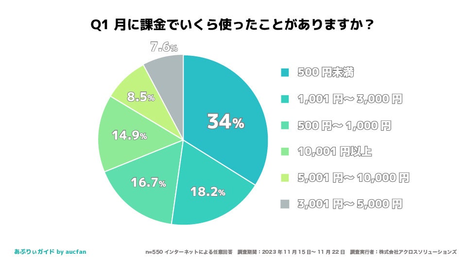「500円未満」と答えた人は34%と、約7割の人は500円以上の課金をしたことがあるということが分かりました。