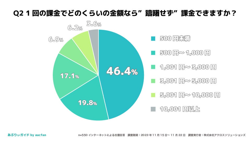 Q2 「500円未満」と答えた人が46.4%と、課金したことがある人の約半数は500円以上の課金に躊躇することが分かりました。