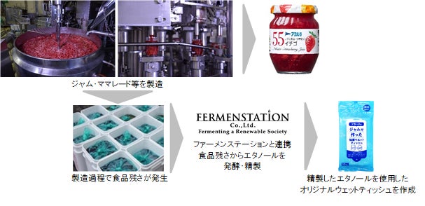 今回、独自の発酵技術で未利用資源を再生・循環させる社会を構築する研究開発型スタートアップの株式会社ファーメンステーション(本社:東京都墨田区、代表取締役:酒井里奈、以下ファーメンステーション)と連携し、製造過程で発生する食品残さを原料にアルコール(エタノール)の発酵・精製に成功しました。これを使用したオリジナルのウェットティッシュを作成し、株主優待品などに使用します。製造過程で発生する食品残さを日用品にアップサイクル※1した当社初の事例になります。