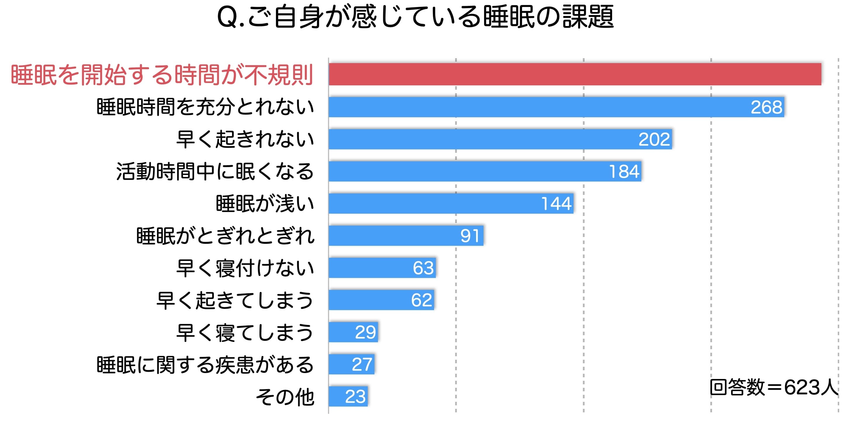 睡眠の課題は、「開始する時間が不規則」が第1位。ライフスタイルの中で不規則になってしまうパターンもあれば、「寝つけない」「眠りが浅い」なと睡眠の質への課題感も多数みられました。また年代に関わらず、就寝前のスマホ利用が睡眠の妨げになっている旨のコメントが多く寄せられました。