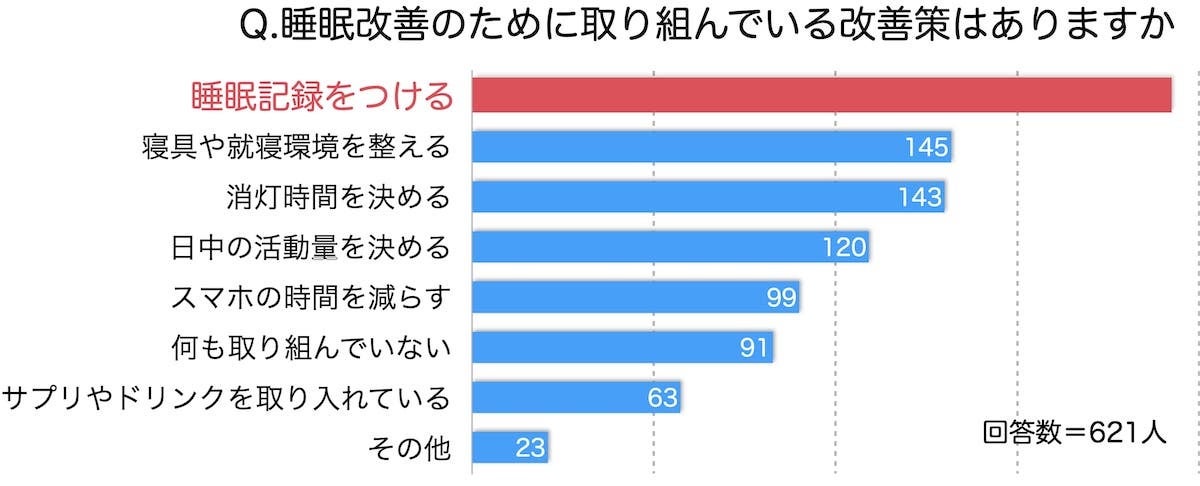 個人で取り組む睡眠改善策の第1位は「睡眠記録をつける」
