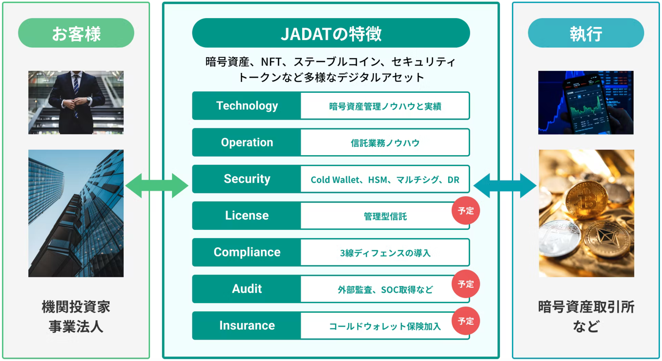 JADATは暗号資産を始めとしたデジタルアセットの価格に連動するファンドや機関投資家、デジタルアセットを活用したビジネスを展開する事業法人に対し、信託及び資産管理機能を提供いたします。