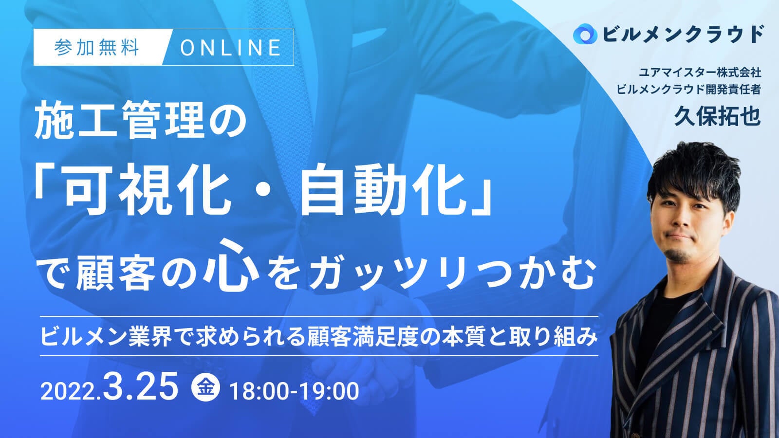 そこで、3月25日(金)に、「ビルメンクラウド」の責任者であり、且つ当社が提供する「ユアマイスター」をプロダクト部長(VPoP)として顧客満足度の改善において実績を残してきた久保より、ビルメンテナンス業界における顧客満足度の向上をテーマにセミナーを開催します。