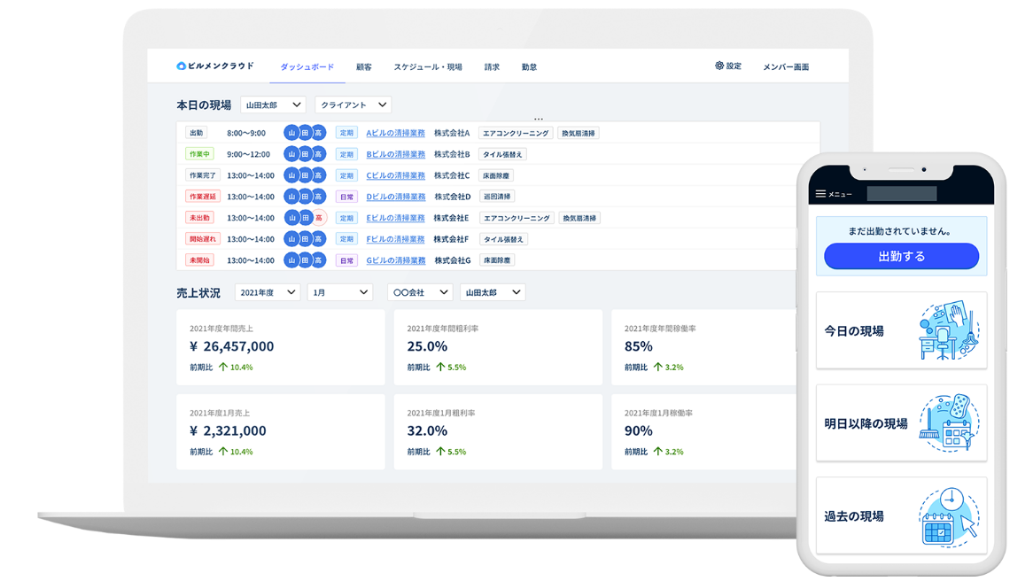 ビルメンテナンス業界の生産性や収益性を向上するSaaS型業務支援サービスです。案件管理、シフト管理、事務作業、現場調査など、従来はマンパワーで対応していたビルメンテナンス関連業務をシステムに置き換え、業務効率化や高収益化を実現することでビルメンテナンス業界における様々な体験のDXを実現し、業界課題である”人手不足”の解消に取り組んでいます。