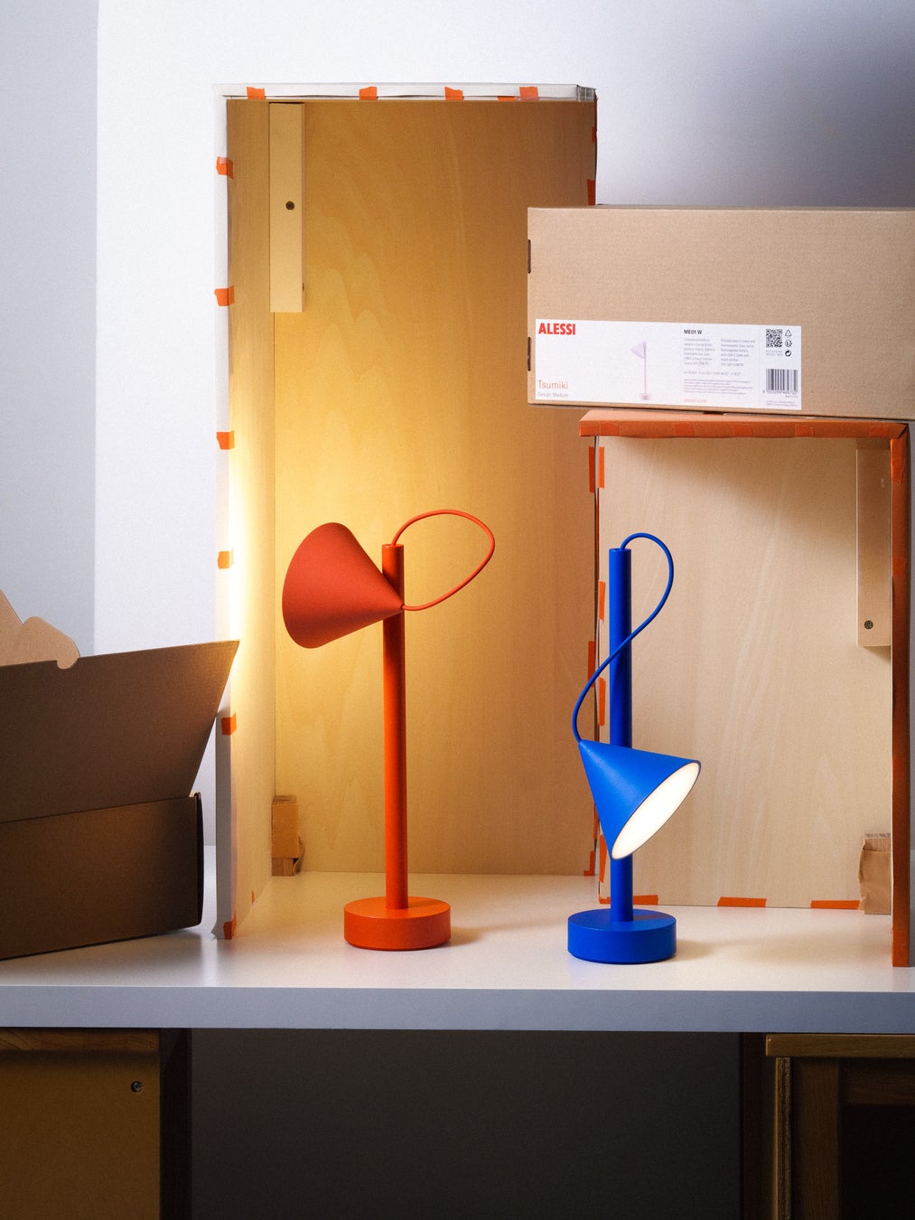 日本語で、ブロック等を積み上げる玩具を指す「つみき」からインスピレーションを受けた充電式のデスクランプ。一般的なテーブルライトを構成するシェード、ステム、ベースという要素を再構築することで新しい照明のあり方をデザインしました。シェードはマグネットでステムに付いており、好みに合わせて上下にスライド、360度回転させることができます。また、ステムにバッテリーを内蔵しているため、ベースから取り外してポータブルライトとして持ち運ぶことも可能。