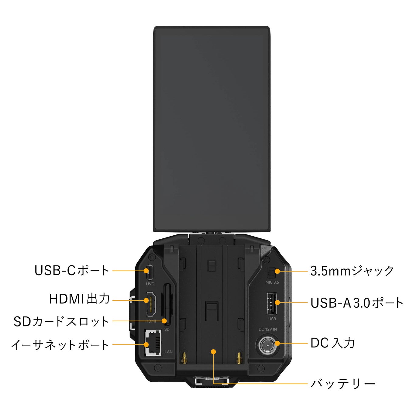 DC電源 3.5mm オーディオ出力 HDMI出力 SDカードスロット USB-C 3.1(UVC用) USB-C 2.0(マイク用) USB-A 3.0 有線LANポート(1Gbps) |