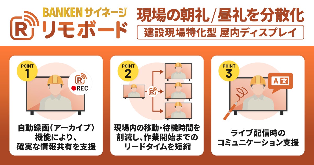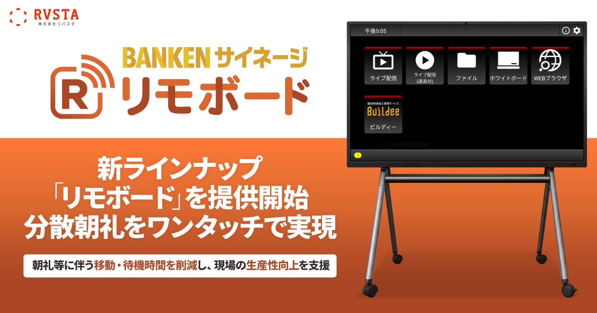 株式会社リバスタ(本社:東京都江東区、代表取締役:高橋巧、以下 当社)が提供する建設現場ICT機器ソリューション「BANKEN」は、「BANKEN サイネージ」の新ラインナップとして、 分散朝礼や打ち合わせ等をワンタッチで実施できる屋内ディスプレイ「リモボード」の正式提供を2026年2月17日より開始します。